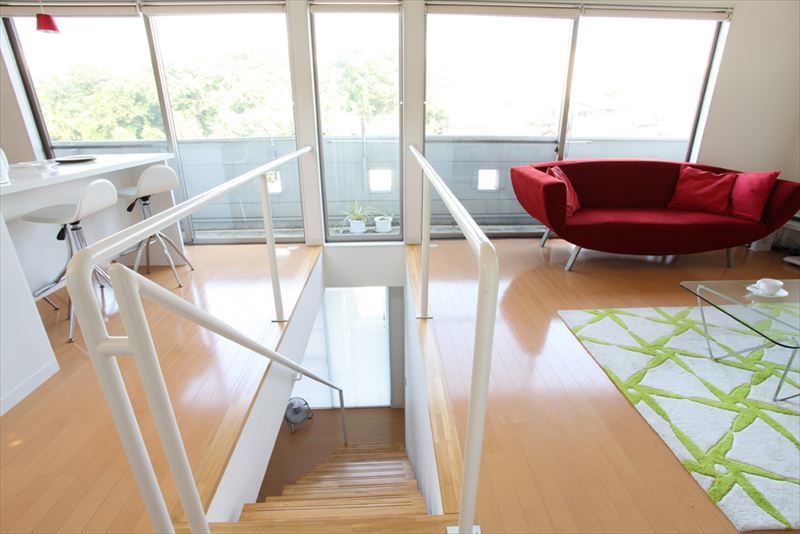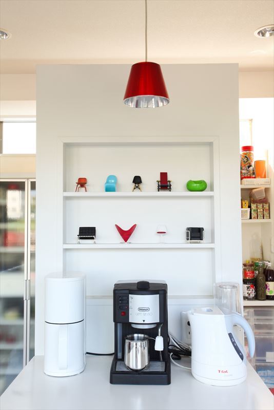 ダイニングテーブルには、インテリアのミニチュアがたくさん飾られています。こんなセンスもライフスタイルの楽しさを感じさせてくれます。 リビングの中央には階段を設けることで、オープンな空間とダイニングキッチンとリビングの空間的な仕切りを表現しています。