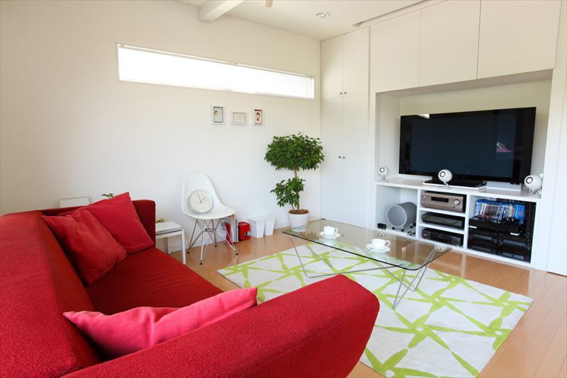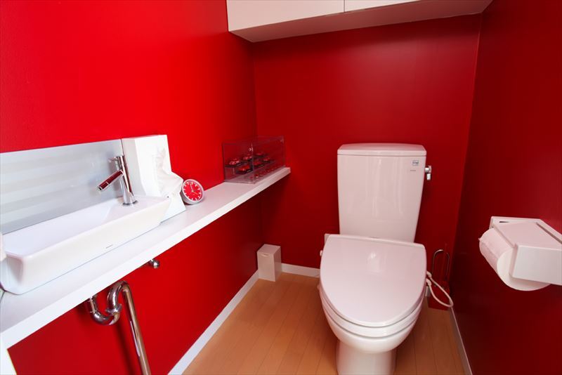収納は壁面いっぱいにジャストフィットしたオリジナルです。このようにきれいに納めることもオリジナルだからこそできることです。 トイレは赤を基調にして遊んでみました。