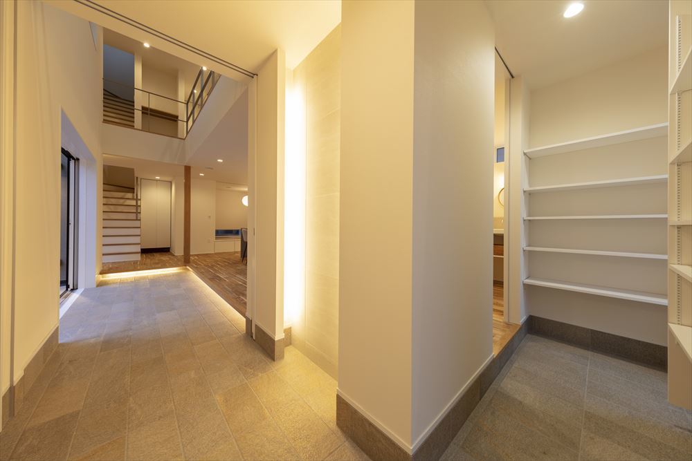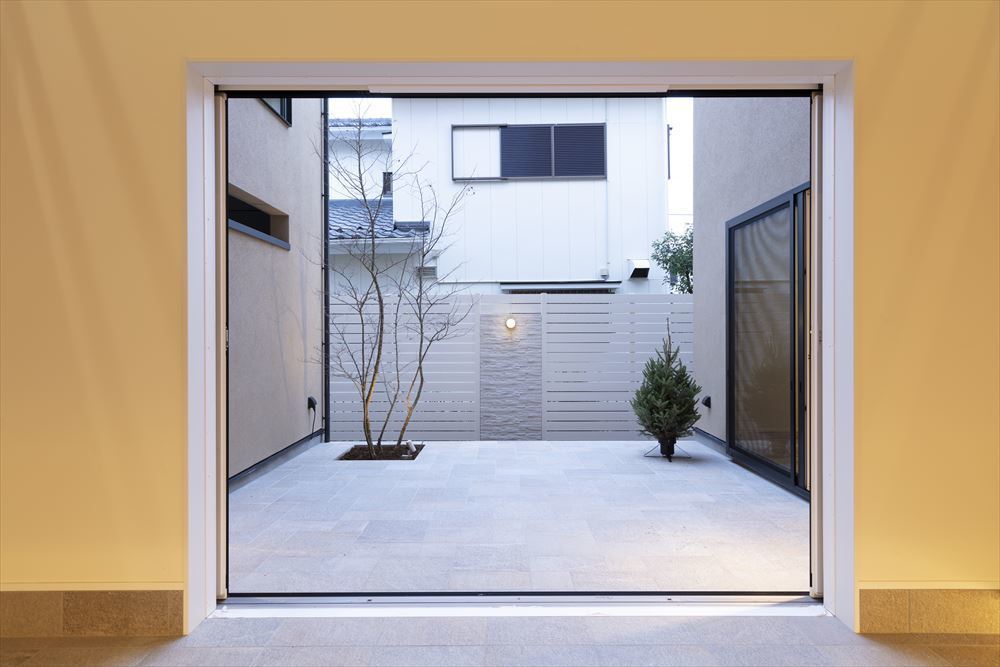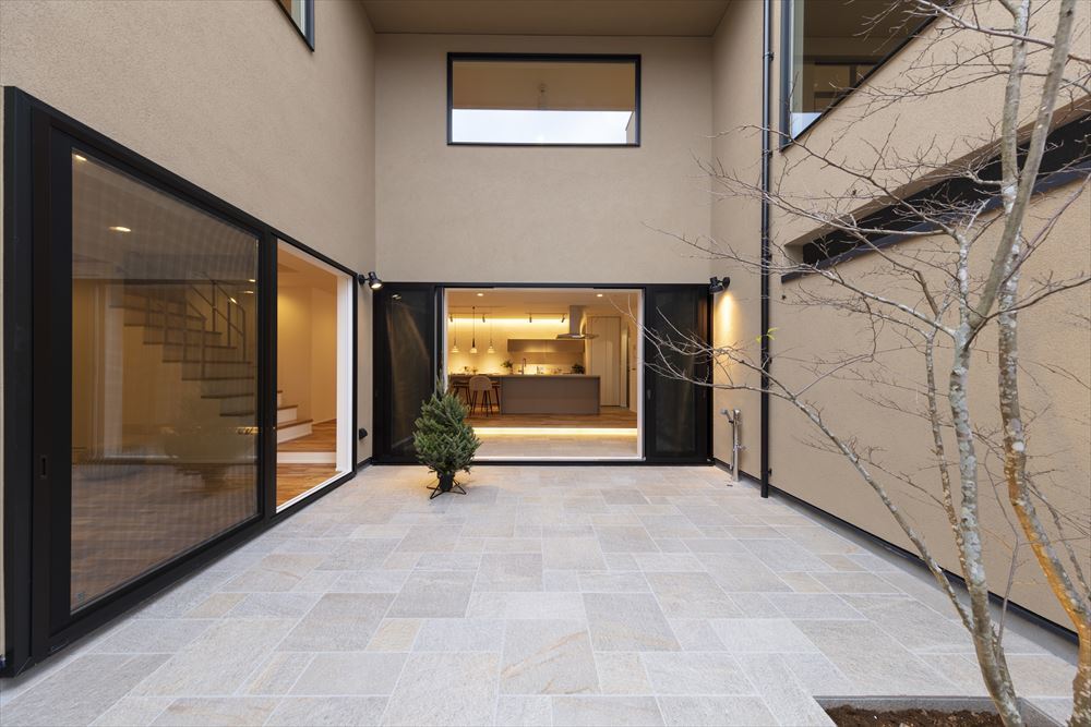 玄関から続く通り土間は吹抜けて、中庭への出口はフルオープンに、外と中の繋がりを演出しています