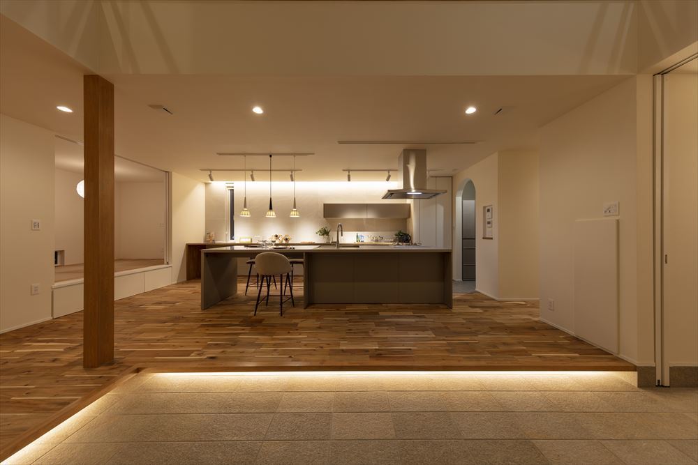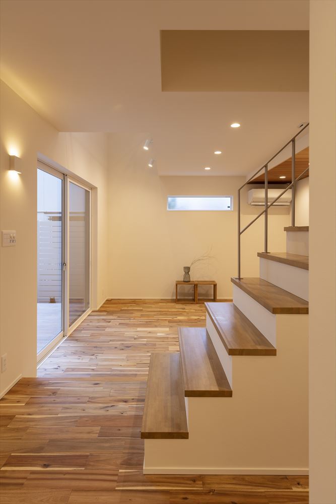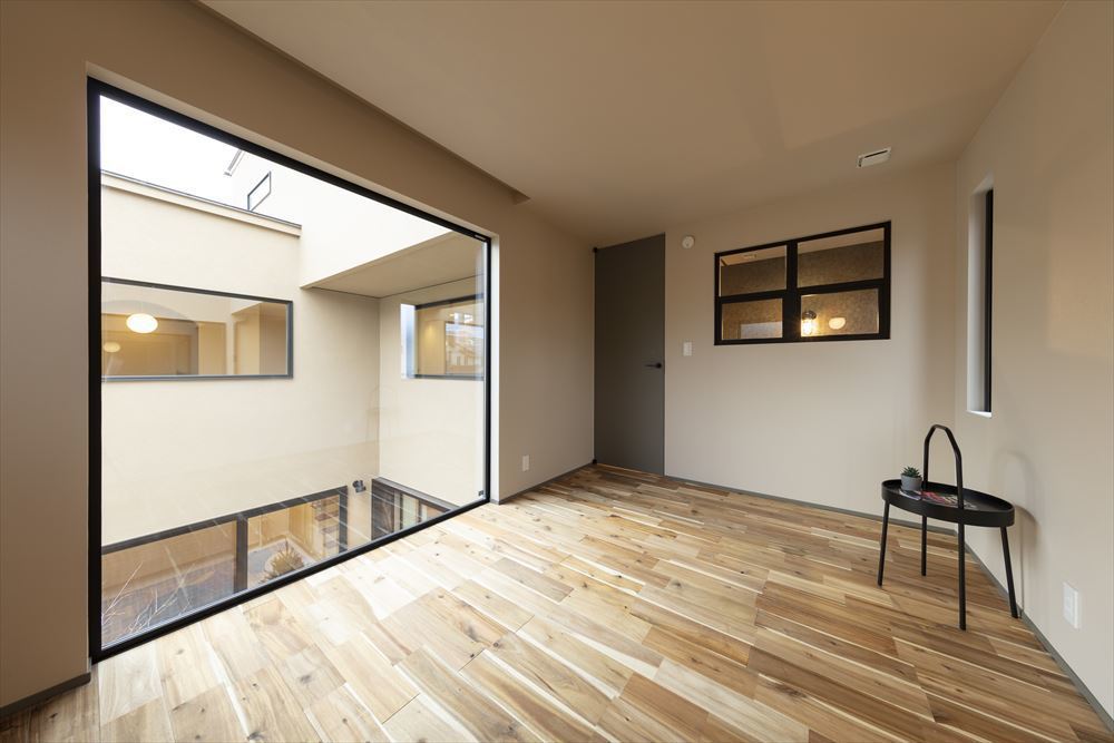 1階リビングはダイニング奥に中庭を囲むように配置し、リビングとの丁度良い距離感を保つ心地の良い空間となっています。
