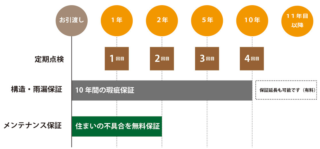 10年目以降については、有料となりますが点検後に保証延長も可能です。