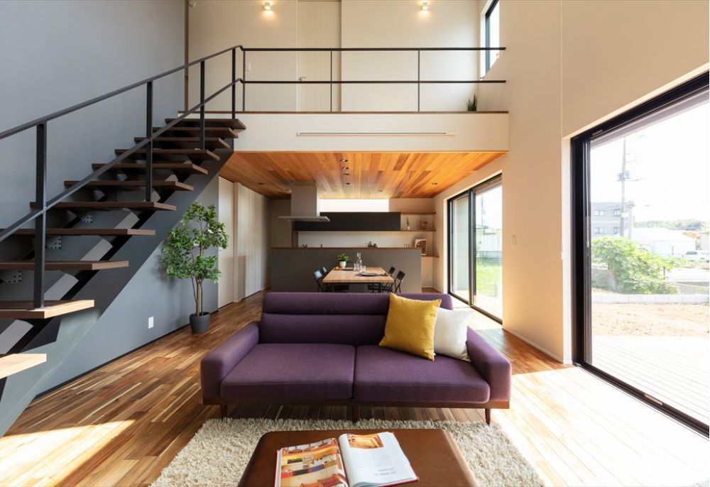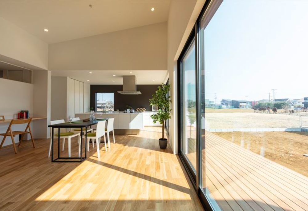中に入れば勾配天井のある 25 帖の LDK と大開口の窓からつながるウッドデッキが開放的な空間を演出しており、ウッドデッキからは愛犬家である施主の思いから広々としたドッグランが広がります。