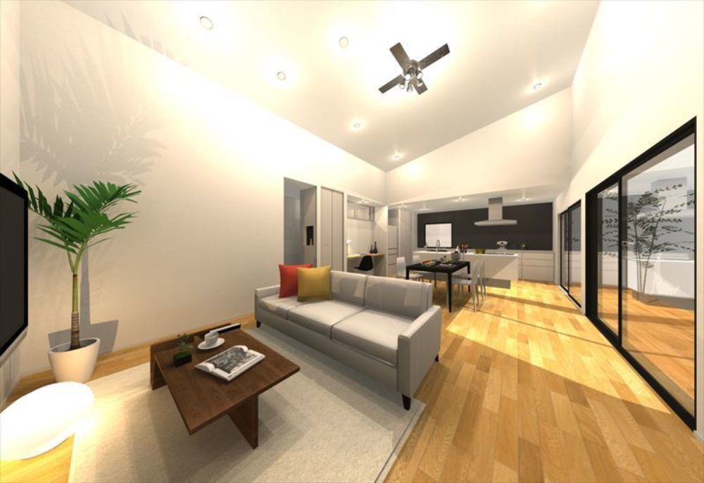 ウッドデッキと繋がる南側に面したLDKは、吹抜けの大空間が広がるリビングとキッチンのレッドシダーの板貼天井をアクセントに、木の温もりを感じる明るく心地の良い素敵な空間に仕上がりました。