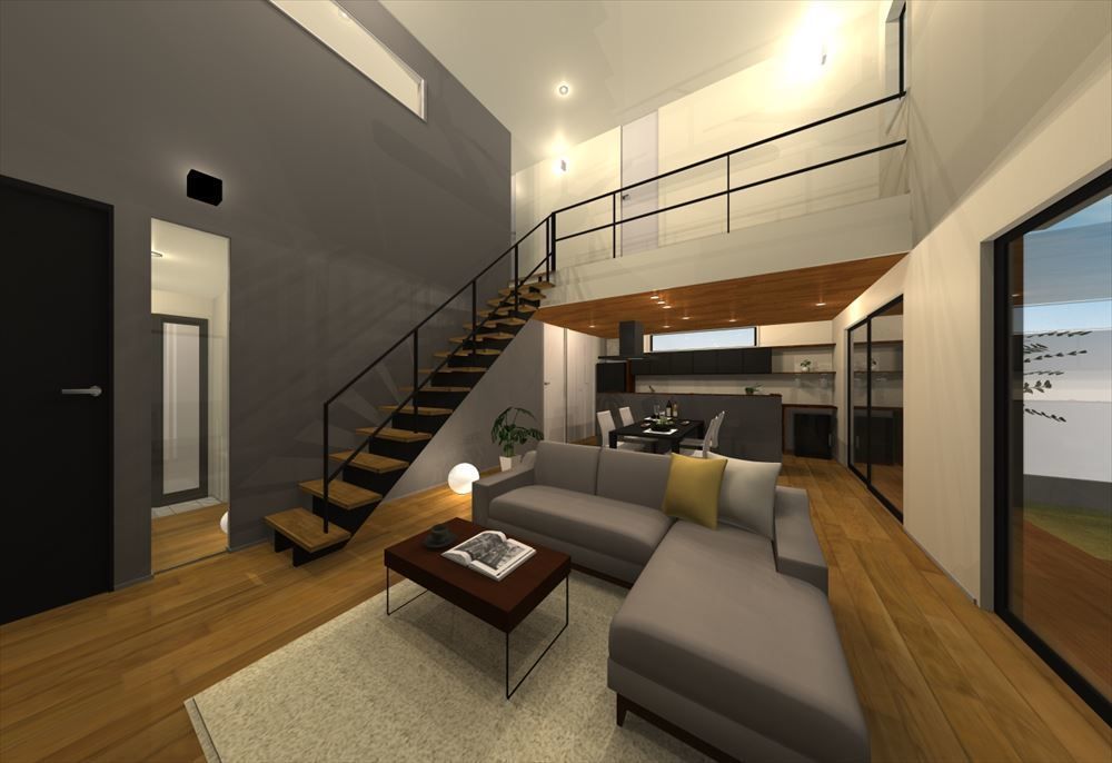 シンプルな外観に開放的な吹き抜けリビングの大空間が特徴のお家です。