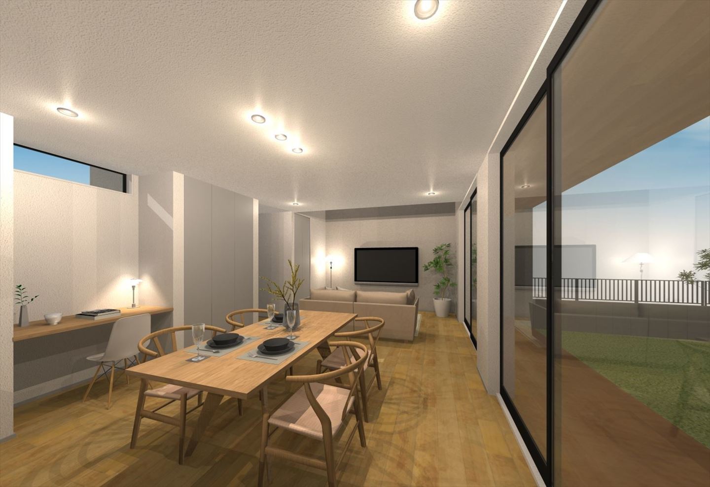 吹抜けのハイサイドの窓から柔らかい光が差し込むLDK は、L 字型のウッドデッキで囲んだ広いお庭とも繋がり、明るく開放的な空間が実現しています。