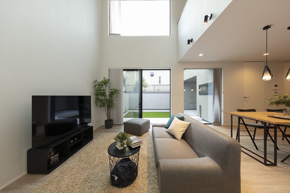 来客時には土間収納の扉を閉めると生活感を感じさせないスッキリとした空間に。オープン階段のあるLDKは、吹抜けの大きな窓から差し込む光によって明るいリビング空間を演出します。