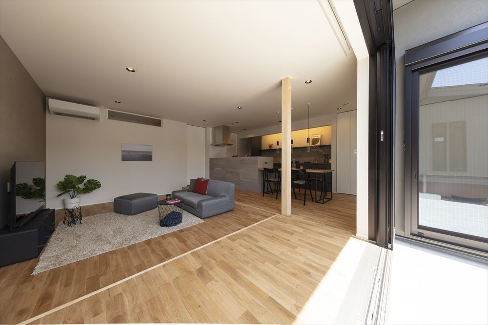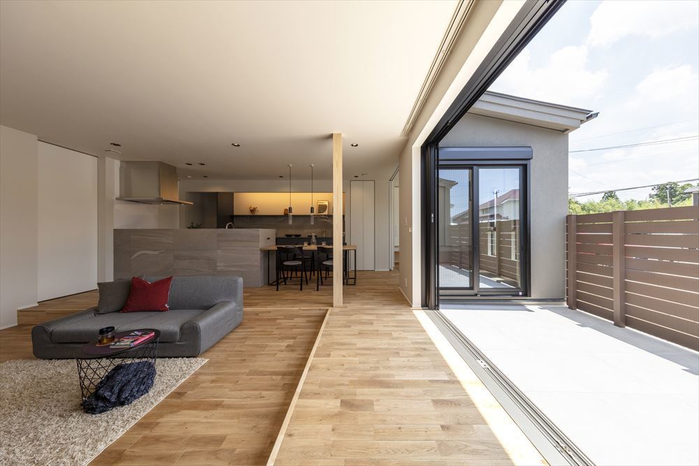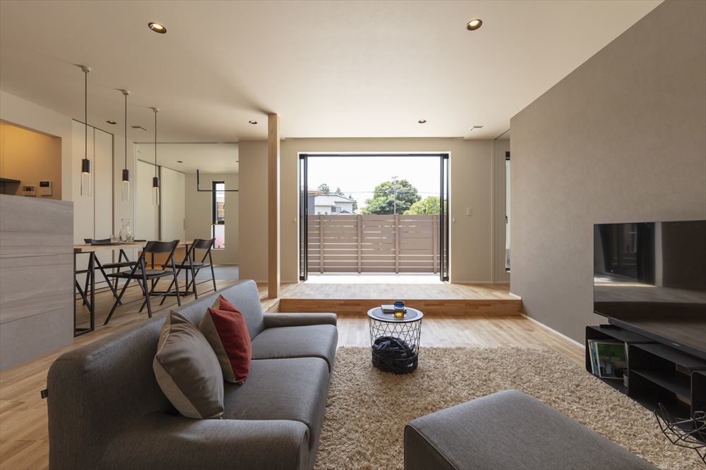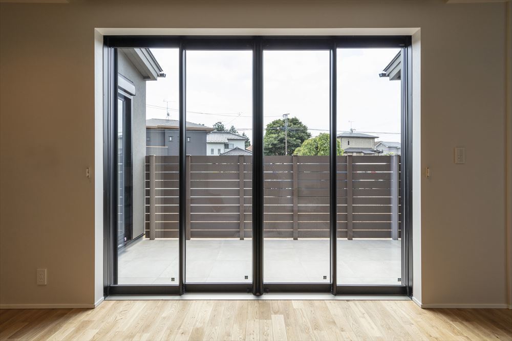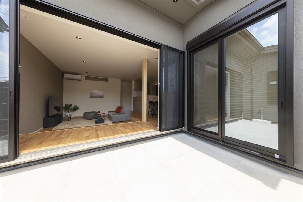 リビングからテラスへと繋がる開口にはフルオープンの大型サッシを配置し、内と外との繋がりを演出しています。