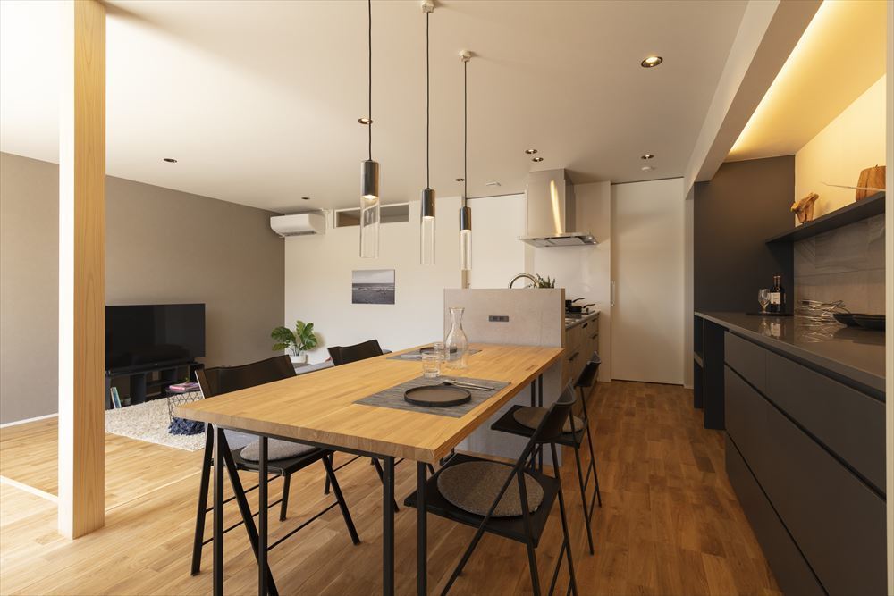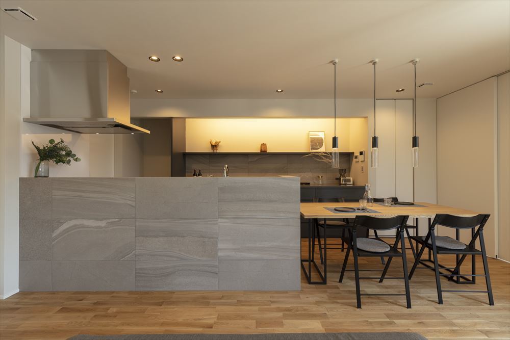 一際目を引くキッチン空間には、大判の石目調タイルを設え、間接照明によって表情の違いを引き出し、上質な空間となっています。