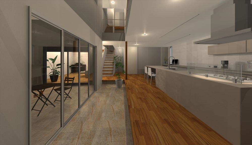 玄関から続く通り土間は吹抜けて、中庭への出口はフルオープンに外と中の繋がりを演出しています。