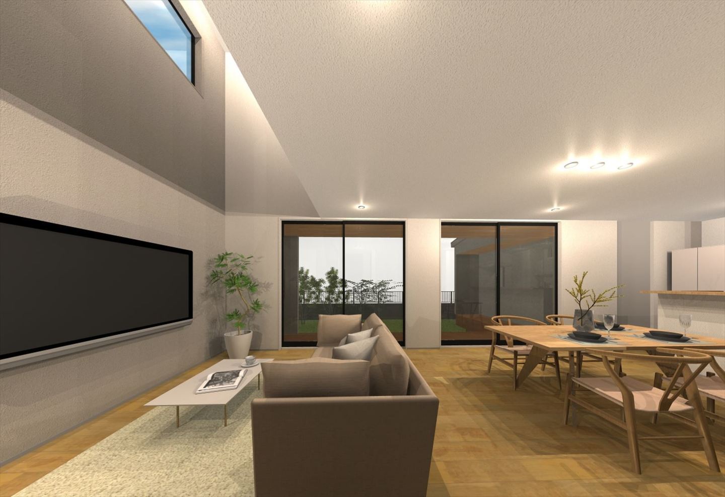 吹抜けのハイサイドの窓から柔らかい光が差し込むLDK は、L 字型のウッドデッキで囲んだ広いお庭とも繋がり、明るく開放的な空間が実現しています。