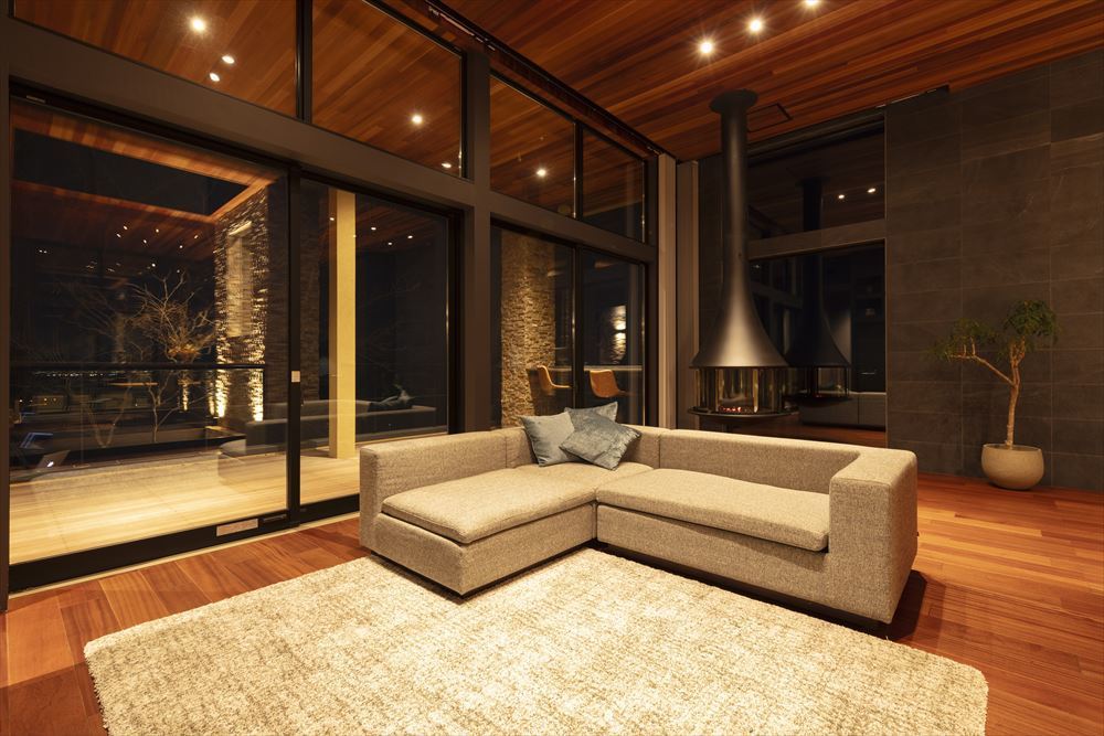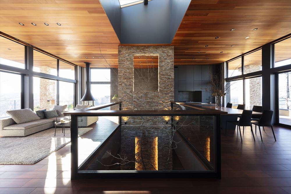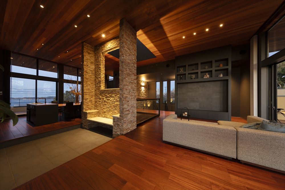 50畳近くある3階のリビングは天井高4mの大空間で、南北両側に大きな開口窓が配置されており、東京湾が一望できて天気の良い日は富士山も見える贅沢な眺望を楽しめる空間となっています。