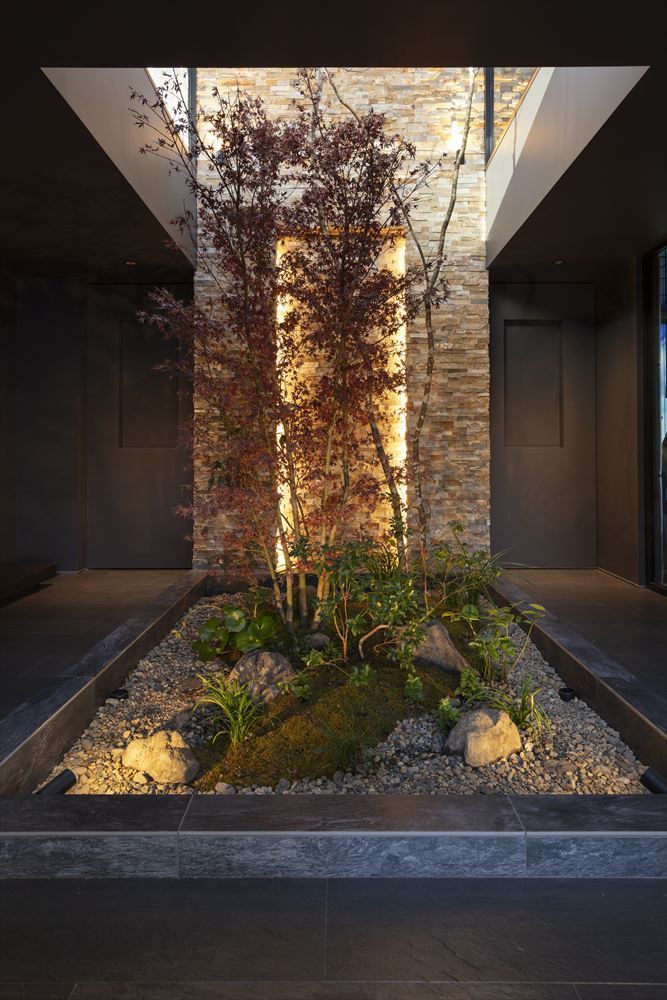 そして2階の玄関から家の中に入ると、正面に植栽が植えられた中庭が目に入ります。建物中央部分に配置されたその中庭は3階まで吹き抜けていて、トップライトからの光が家中に差し込みます。
