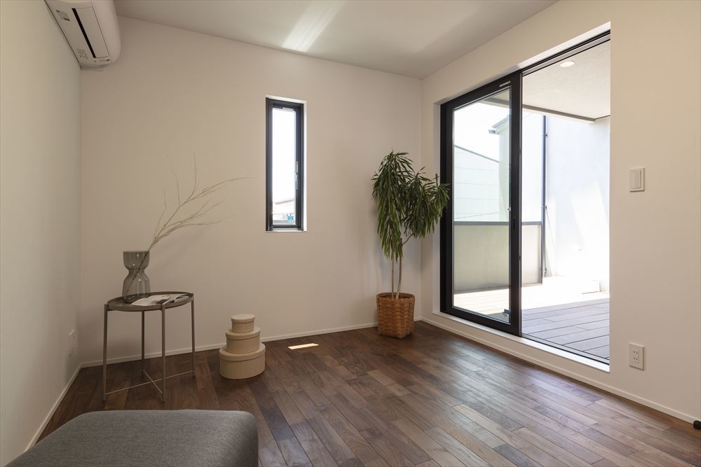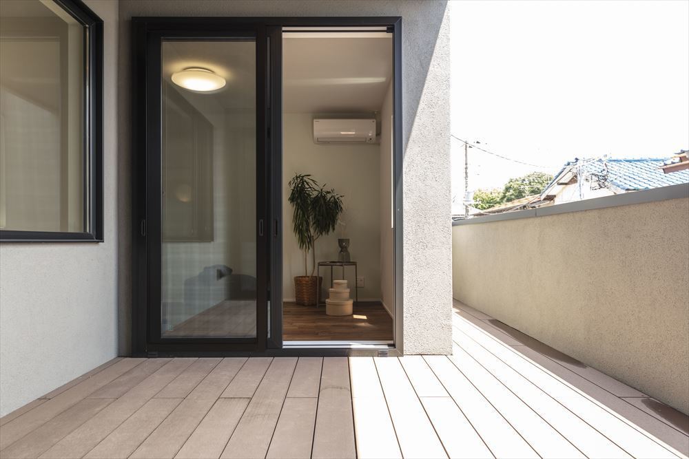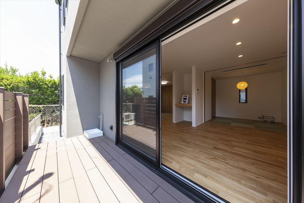 2階の子世帯には、リビングと寝室をつなぐ大型のウッドデッキバルコニーが配置され、上部に屋根を配置しインナーバルコニーとなっています。。