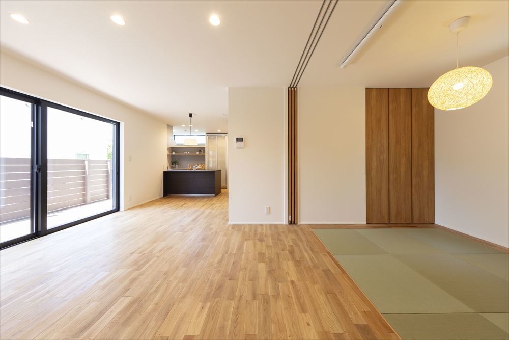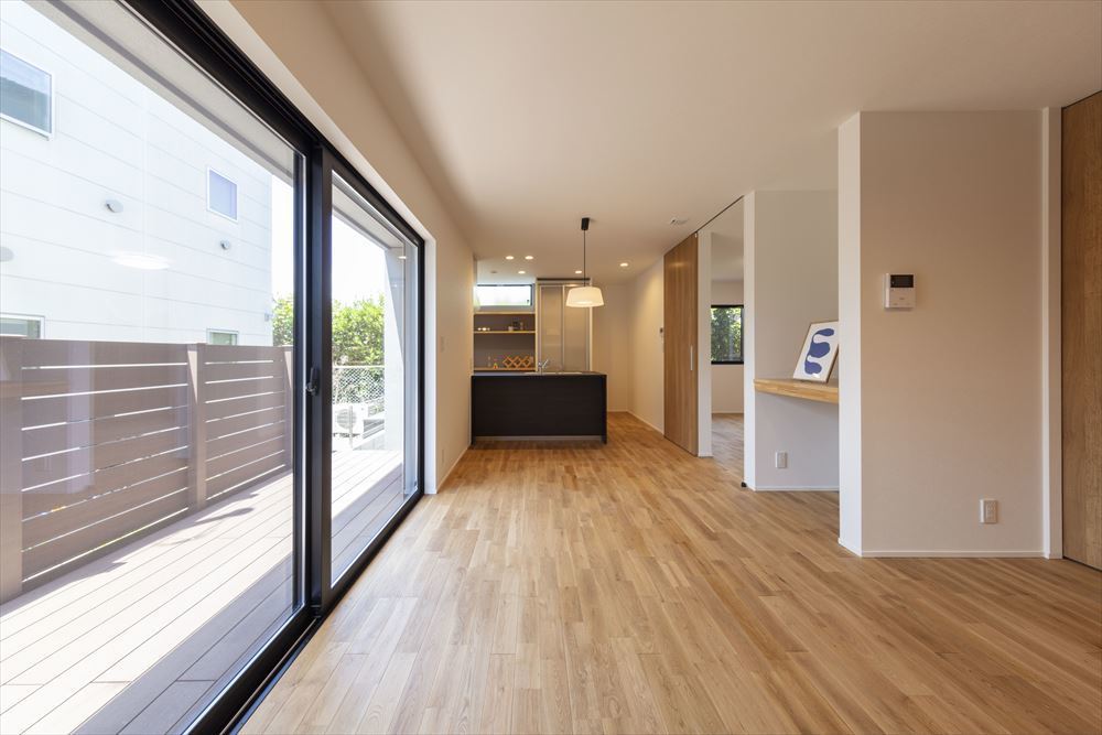 1階に位置する親世帯では、奥様がガーデニングを愉しみたいとのご要望で、ウッドデッキはリビングから繋がっており、外からは視線を感じさせない工夫があります。