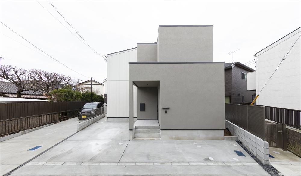 ガルバ×塗り壁の外壁材を採用し、シンプルかつモダンな外観が特徴です。