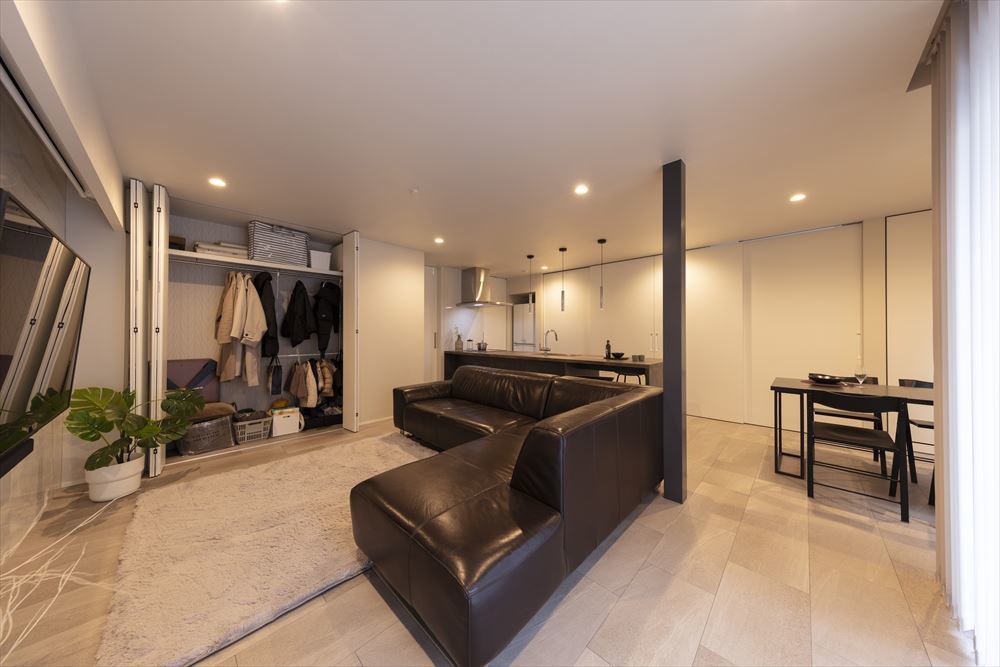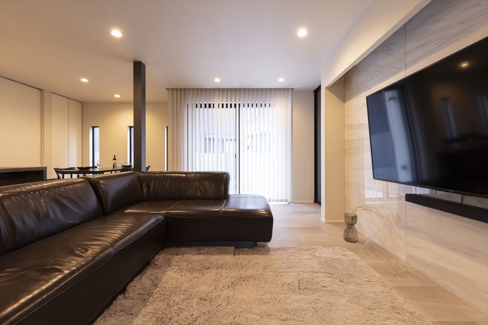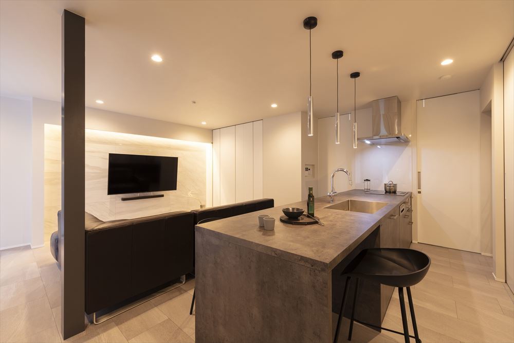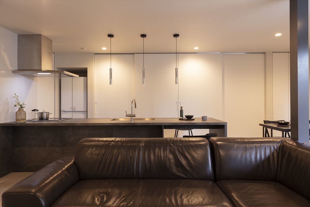石目調の床で設えたLDKは、落ち着きのある洗練された空間です。