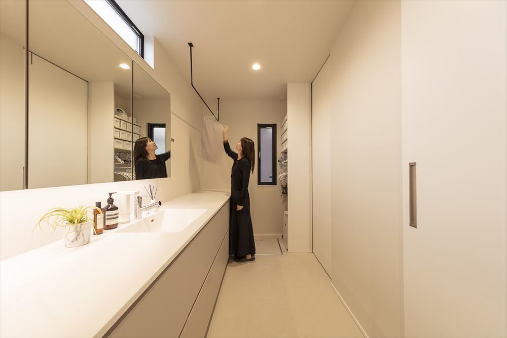 また、奥様のこだわりが詰まったランドリーは、造作洗面台や計画された収納など魅力がたっぷり詰まっています。