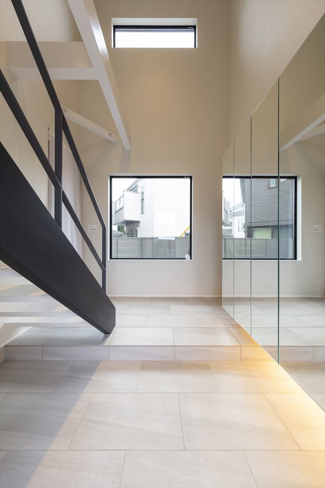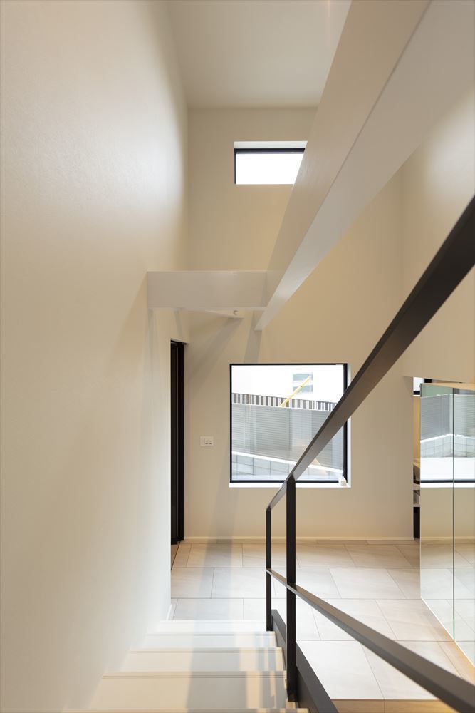 玄関の吹き抜けからは心地よい日が差し、明るい空間になっています。