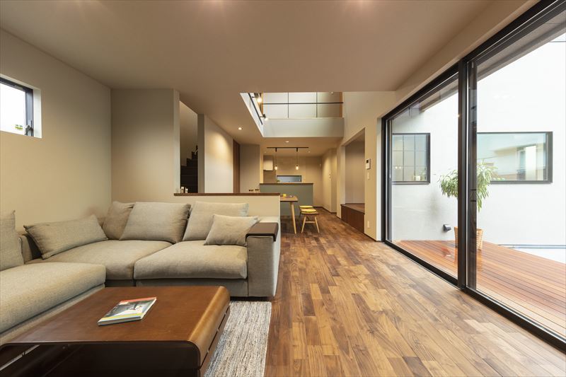 シンプルな外観からは想像もつかない程、中庭を中心としたコートハウスになっており明るく広々した空間が広がっています。