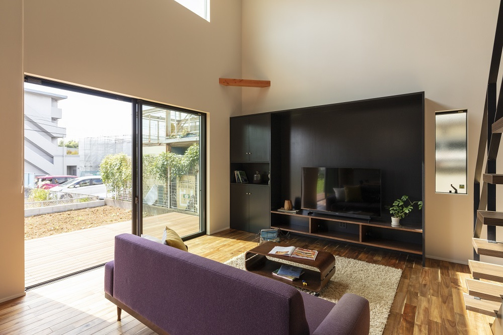 また、テレビボードと収納を兼ね備えたオリジナルの大型造作家具も見所です。