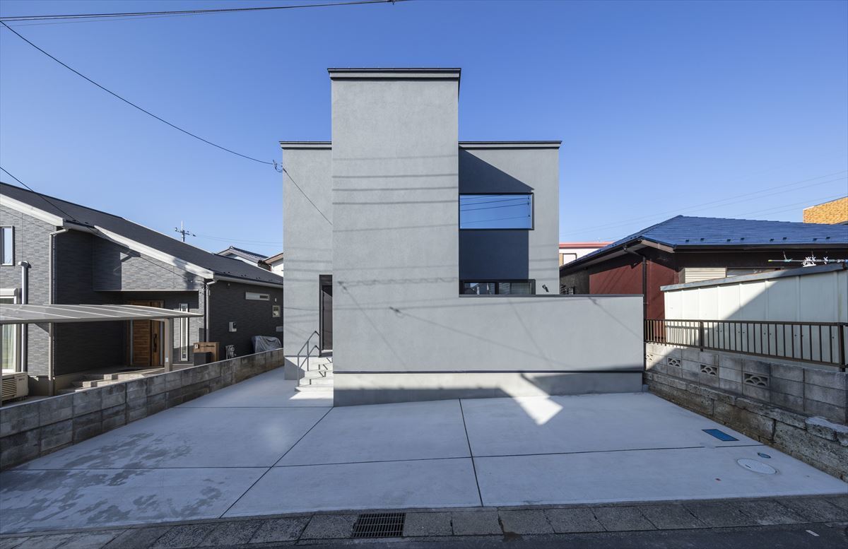 L型にせり出した壁が象徴的なファサードのお家です。